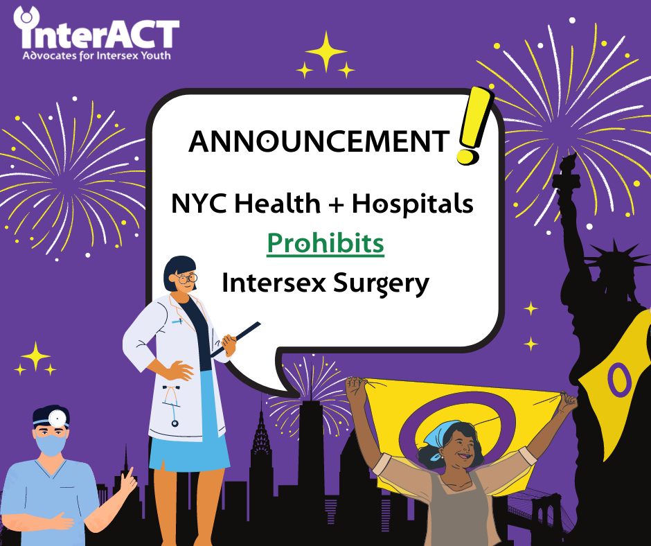 interACT obtained the exact language of the new intersex-affirming policy of NYC Health and Hospitals. As a result of interACT’s advocacy and that of so many intersex activists, the largest public health care system in the United States (covering over 70 facilities across NYC!) will now prohibit surgeries on intersex youth!!!